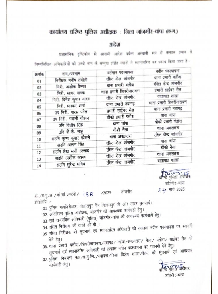 जांजगीर, 24 मार्च । जिले ने पुलिस अधीक्षक ने एक बड़ा फिर पुलिसकर्मियों का तबादला आदेश जारी किया है, जिसमें 5 निरीक्षकों सहित 14 पुलिसकर्मी प्रभावित हुए है।