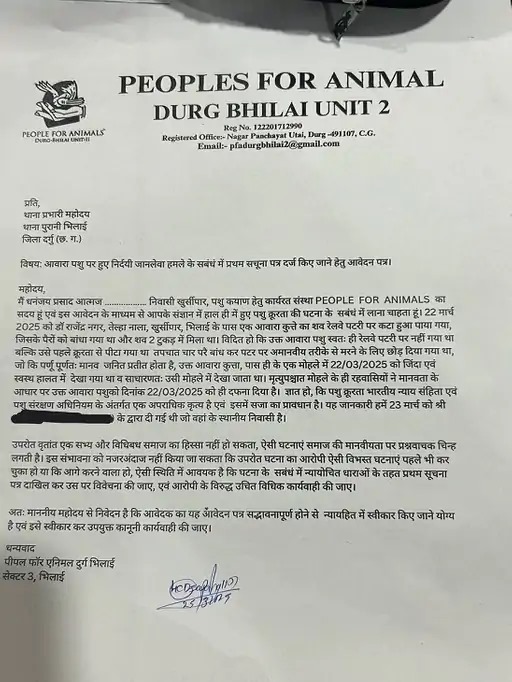 पीएसए के मैनेजर धनंजय प्रसाद ने बताया कि उन्हें जैसे ही मामले की जानकारी हुई उनके सदस्य रेलवे ट्रैक में पहुंचे। उन्होंने कुत्ते की बॉडी को बोरे भरा और थाने लेकर पहुंचे। इसके बाद पुलिस को लिखित शिकायत देकर कार्रवाई की मांग की गई।