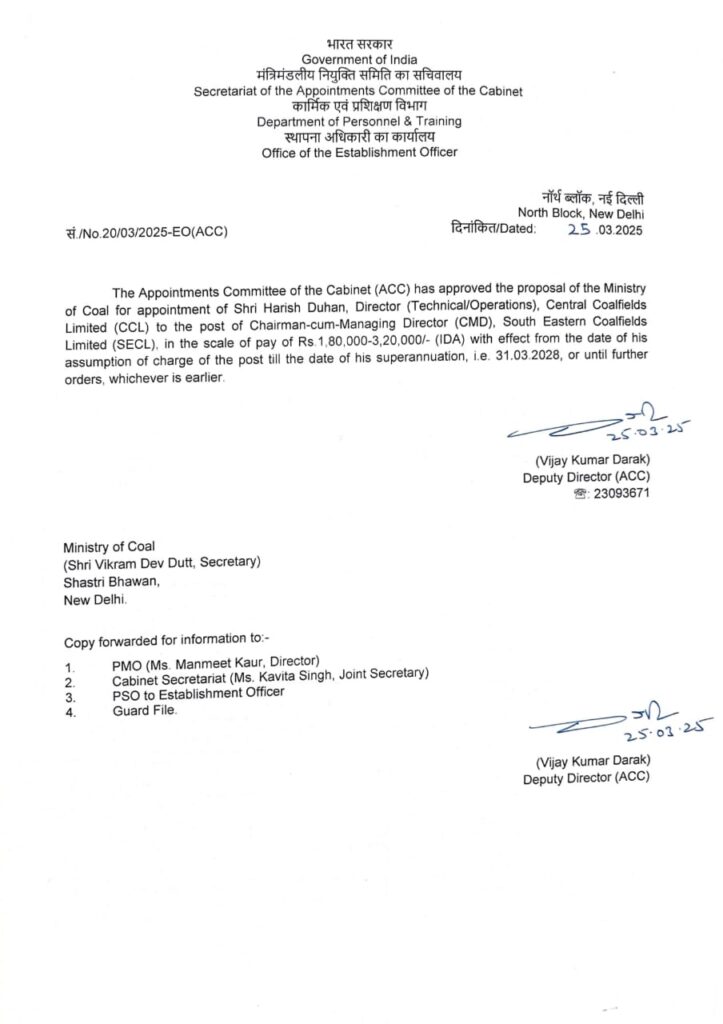 केंद्र सरकार ने साउथ ईस्टर्न कोलफील्ड्स लिमिटेड (एसईसीएल) के नए चेयरमैन-कम-मैनेजिंग डायरेक्टर (CMD) की नियुक्ति की है। हरीश दुहान, जो वर्तमान में सेंट्रल कोलफील्ड्स लिमिटेड (सीसीएल) में डायरेक्टर (टेक्निकल/ऑपरेशन्स) हैं, को एसईसीएल के CMD के रूप में नियुक्त किया गया है। उनकी नियुक्ति 25 मार्च 2025 से प्रभावी होगी और वे 31 मार्च 2028 तक इस पद पर रहेंगे।