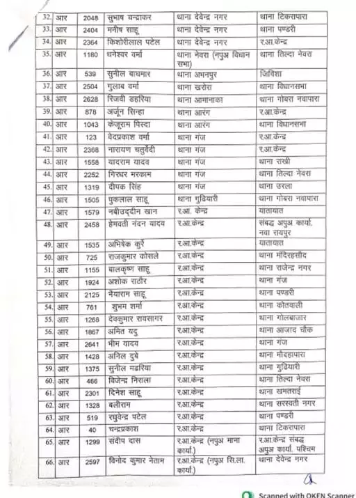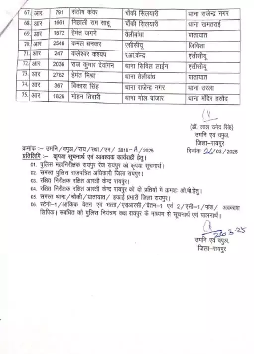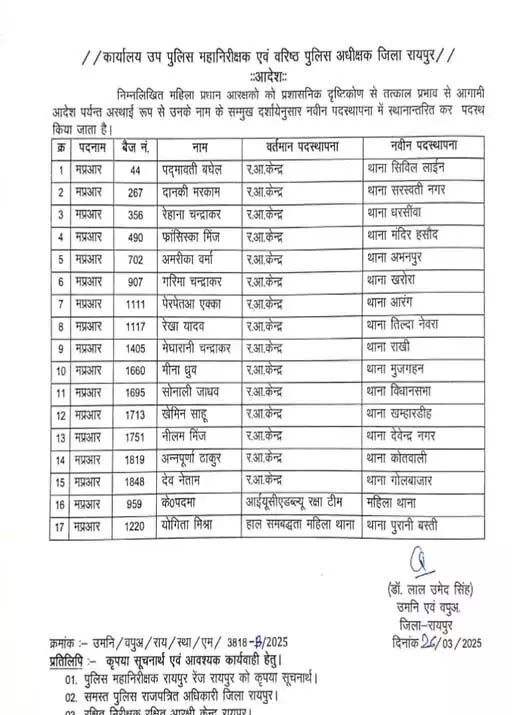 इस फेरबदल में महिला कांस्टेबल और हेड कांस्टेबल भी शामिल हैं। यह फेरबदल रायपुर पुलिस को और अधिक मजबूत और प्रभावी बनाने में मदद करेगा।