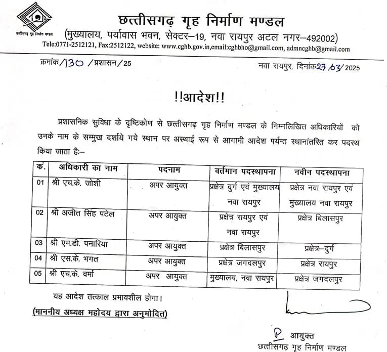 रायपुर, 27 मार्च । प्रदेश में हाउसिंग बोर्ड में लंबे समय से जमे अधिकारियों को इधर से इधर किया गया है। हाउसिंग बोर्ड की तरफ से इस संदर्भ में आदेश जारी कर दिया है। जिन अधिकारियोंका तबादला किया गया है।