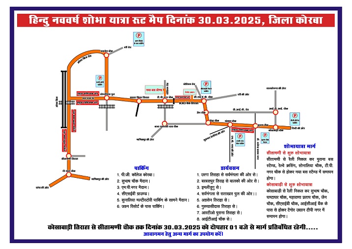 कोरबा,28 मार्च 2025 (वेदांत समाचार)। जिले में हिंदू नववर्ष शोभा यात्रा का आयोजन 30 मार्च 2025 को किया जाएगा। इस अवसर पर एक शोभा यात्रा निकाली जाएगी, जिसके लिए एक निर्धारित रूट मैप तैयार किया गया है।
