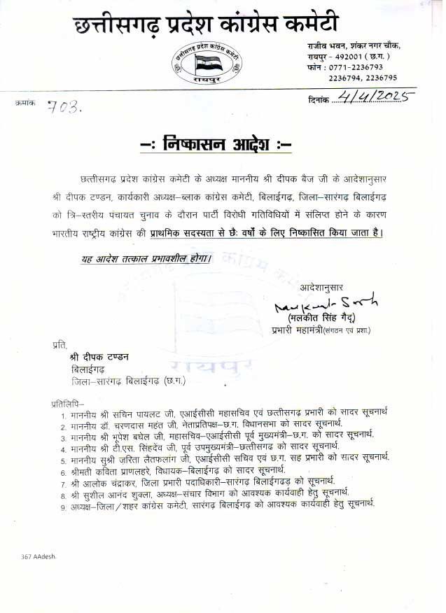 प्रदेश कांग्रेस कमेटी की ओर से जारी आदेश में कहा गया है कि त्रि-स्तरीय पंचायत चुनाव के दौरान दीपक टंडन ने पार्टी विरोधी गतिविधियों में संलिप्तता दिखाई, जिससे संगठन की छवि धूमिल हुई। इस आधार पर उनकी प्राथमिक सदस्यता भी छह साल के लिए निलंबित कर दी गई है। कांग्रेस संगठन ने साफ किया है कि पार्टी अनुशासन तोड़ने वालों के खिलाफ सख्त कदम उठाए जाएंगे।