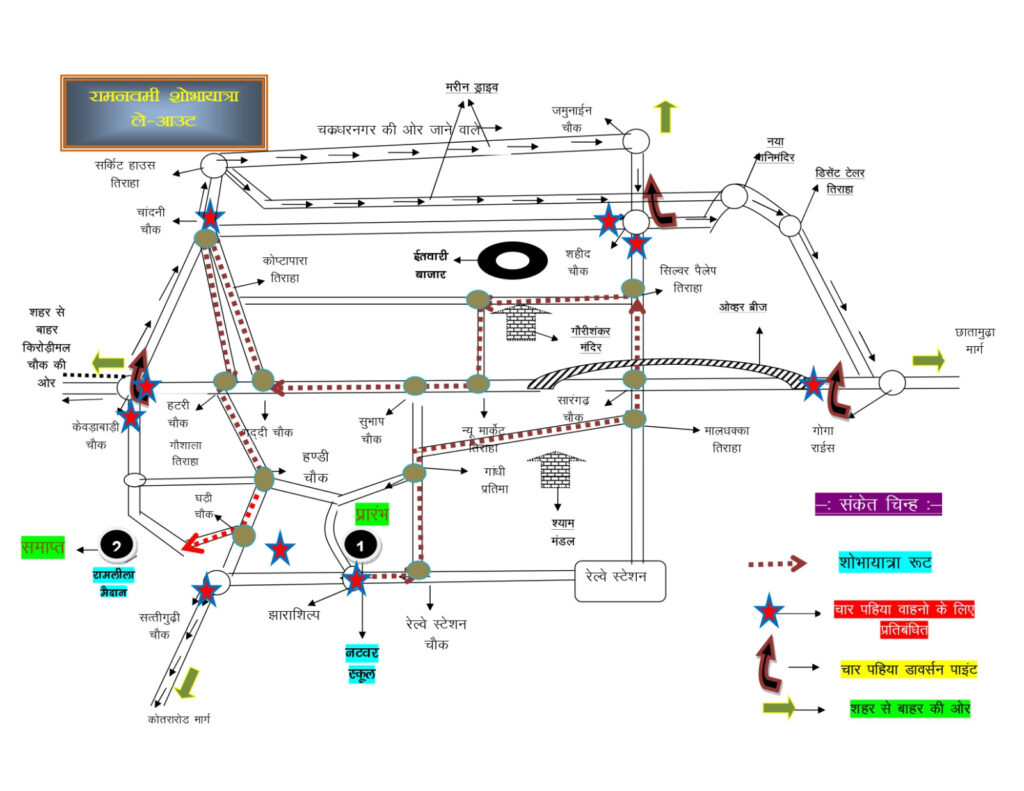 - किरोड़ीमल चौक की ओर से आने वाली यातायात शोभायात्रा प्रारंभ होने के 02 घंटे पूर्व केवडाबाड़ी चौक से मधुबनपारा मार्ग से सर्किट हाउस एवं मरीन ड्राइव का उपयोग कर नया शनिमंदिर, डिसेंट टेलर तिराहा होकर गंतव्य को जा सकते हैं।