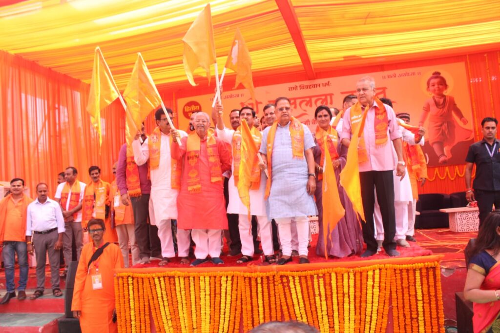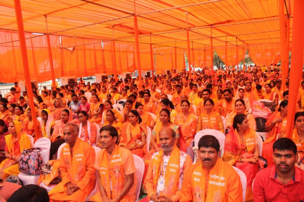 विनीत चौहान,बिलासपुर। चैत्र नवरात्र के अष्टमी तिथि पर बिलासपुर के पुलिस मैदान से प्रभु श्रीराम की नगरी अयोध्या के लिए 1008 श्रद्धालुओं का विशाल जत्था रवाना हुआ। जत्थे के हर श्रद्धालु भगवा वस्त्र, तिलक और पटका धारण किए हुए प्रभु के नाम का स्मरण करता दिखा। दोपहर दो बजे जैसे ही मंच से महाआरती की गई, पूरा परिसर ‘जय श्रीराम’ के उद्घोष से गूंज उठा। मंच पर प्रमुख रूप से परम बाबा आश्रम के महंत श्री श्री 1008 त्यागी प्रेमदास जी महाराज, केंद्रीय राज्य मंत्री तोखन साहू, नगर विधायक अमर अग्रवाल, बिल्हा विधायक धरमलाल कौशिक, तखतपुर विधायक धरमजीत सिंह, कोटा विधायक अटल श्रीवास्तव, महापौर पूजा विधानी एवं यात्रा संयोजक एवं समाजसेवी प्रवीणा झा सहित अन्य विशिष्टजन मौजूद थे।