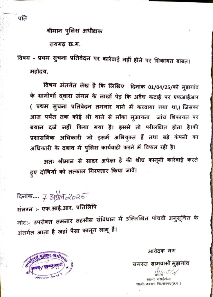 विकास चौहान, तमनार। मुड़ागांव के जागरूक ग्रामीणों द्वारा जंगल में हो रही लाखों पेड़ों की अवैध कटाई के विरोध में तमनार थाना में FIR दर्ज करवाई गई थी। ग्रामीणों का आरोप है कि जंगल की इस अवैध कटाई में बड़े-बड़े कंपनी के अधिकारी एवं कुछ स्थानीय प्रभावशाली लोग शामिल हैं।