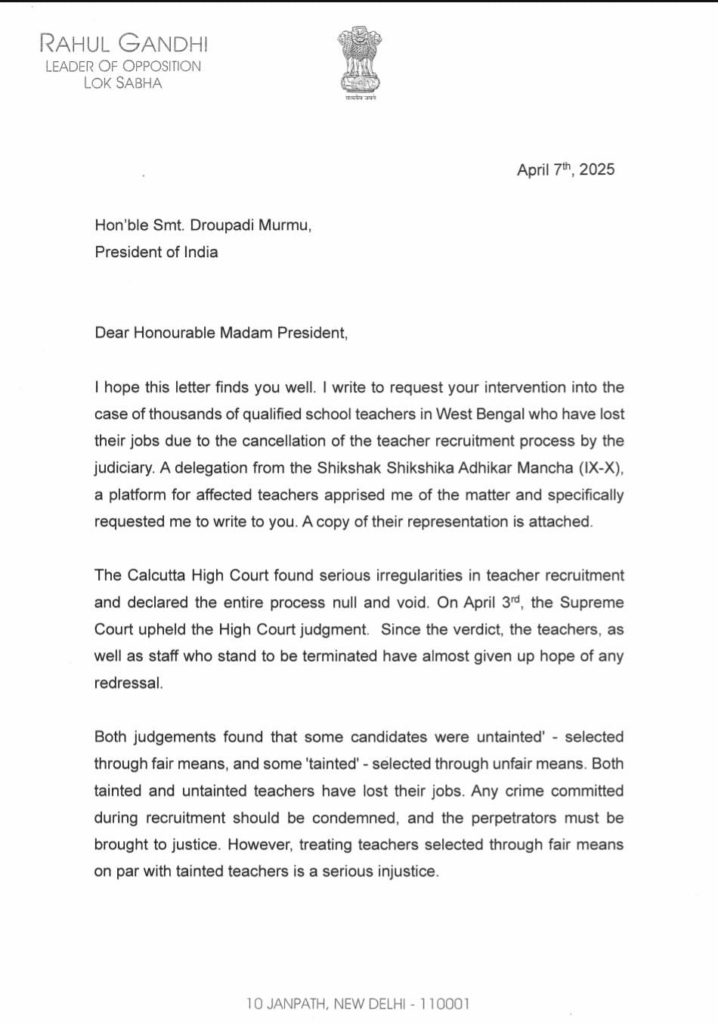 दिल्ली। लोकसभा में नेता प्रतिपक्ष और कांग्रेस सांसद राहुल गांधी ने भारत की राष्ट्रपति द्रौपदी मुर्मू को पत्र लिखकर पश्चिम बंगाल में हजारों योग्य स्कूली शिक्षकों के मामले में हस्तक्षेप करने की मांग की है। इन शिक्षकों ने न्यायपालिका द्वारा शिक्षक भर्ती प्रक्रिया को रद्द करने के बाद अपनी नौकरी गंवा दी है।