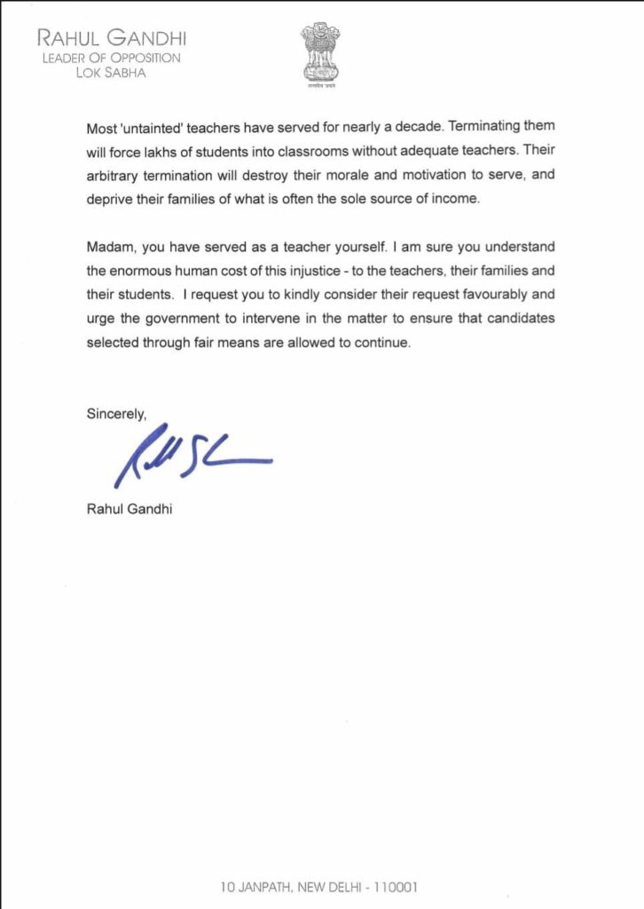 राहुल गांधी ने अपने पत्र में राष्ट्रपति से अनुरोध किया है कि वे सरकार से यह सुनिश्चित करने के लिए आवश्यक कदम उठाने का आग्रह करें कि निष्पक्ष तरीके से चयनित उम्मीदवारों को पद पर बने रहने की अनुमति दी जाए। इससे पहले अधीर रंजन चौधरी ने भी राष्ट्रपति द्रौपदी मुर्मू को पत्र लिखकर आरोप लगाया था कि पश्चिम बंगाल में अराजक स्थिति है।