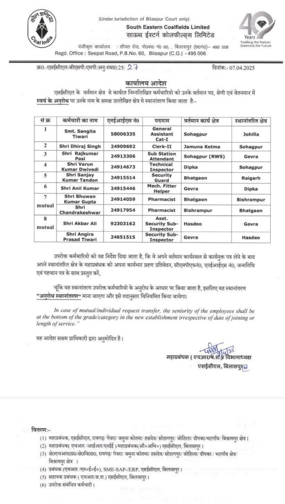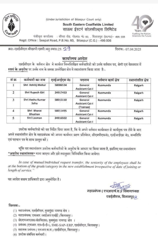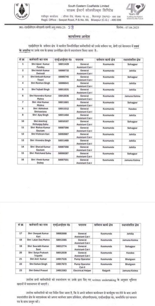 कोरबा। एसईसीएल के वर्तमान क्षेत्र में कार्यरत कोयला कर्मचारियों को उनके वर्तमान पद, श्रेणी एवं वेतनमान में स्वयं के अनुरोध पर स्थानांतरित किया गया है। इनमें कोरबा जिले की दीपका, गेवरा व कुसमुंडा समेत SECL के 36 कोलकर्मियों का तबादला किया गया है। इनमें कुसमुंडा क्षेत्र के 22 व रायगढ़ से एक कर्मी के स्थानांतरण पर उनके द्वारा दिए गए रिटेन अंडरटेकिंग के अनुसार भूमिगत खदानों में पदस्थापना दी जाएगी।