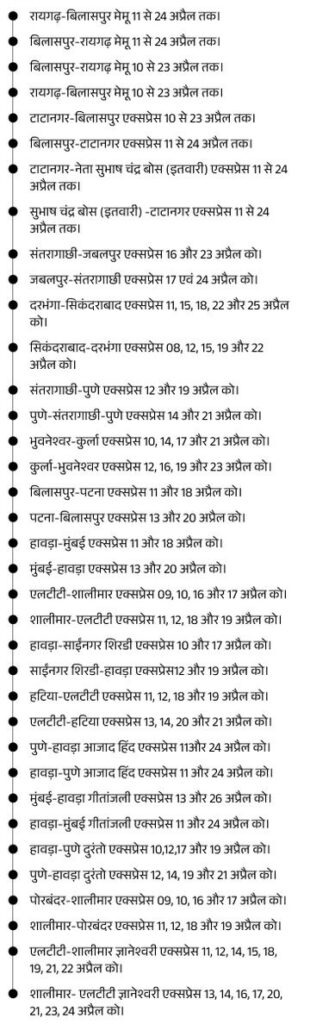 रायगढ़-निजामुद्दीन गोंडवाना एक्सप्रेस 11, 12, 14, 16, 17, 18, 19, 21, 23 और 24 अप्रैल को रायगढ़ और बिलासपुर के बीच रद्द रहेगी।