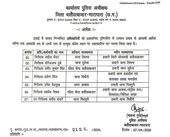 जारी आदेश के अनुसार लखेश केंवट को कोतवाली थाना प्रभारी बनाया गया है, प्रमोद सिंह को सुहेला थाना की जिम्मेदारी दी गई है, धीरेन्द्र नाथ दुबे को सिमगा थाना प्रभारी नियुक्त किया गया है, वहीं प्रवीण मिंज को कसडोल थाना की कमान सौंपी गई है। इस बदलाव को पुलिस विभाग में कार्यप्रणाली सुधार और बेहतर नियंत्रण की दिशा में अहम कदम माना जा रहा है।