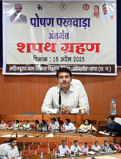 कलेक्टर आकाश छिकारा ने कलेक्टोरेट सभाकक्ष में पोषण पखवाड़ा के संबंध में बैठक ली। बैठक में कलेक्टर ने पोषण पखवाड़ा अंतर्गत बच्चों के स्वास्थ्य, पोषण तथा सुपोषण की श्रेणी में लाने के लिए जनजागरूकता अभियान चलाने कहा। कलेक्टर ने बच्चों को मिलने वाला पोषण आहार गुणवत्तापूर्ण यह सुनिश्चित करने कहा। उन्होंने सभी संबंधित विभागों साथ मिलकर समन्वय से नागरिकों को पोषण के प्रति जागरूक करने कहा। उन्होंने पोषण पखवाड़ा के तहत ‘‘पोषण अभियान जन आंदोलन पोर्टल‘‘ में नियमित गतिविधियों को शत प्रतिशत अपलोड करने एवं संबंधित विभागों से निर्धारित गतिविधि कराने के निर्देश दिए। इस अवसर पर जिला पंचायत सीईओ गोकुल कुमार रावटे, अपर कलेक्टर ज्ञानेन्द्र सिंह ठाकुर, जिला कार्यक्रम अधिकारी महिला एवं बाल विकास विभाग श्रीमती अनिता अग्रवाल सहित अन्य अधिकारी-कर्मचारी उपस्थित थे।