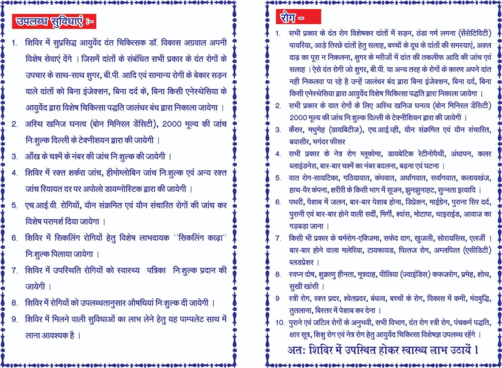 - शिविर में निशुल्क औषधि देने, परामर्श एवं उपचार के साथ स्वास्थ्य पुस्तिका निशुल्क दी जाएगी