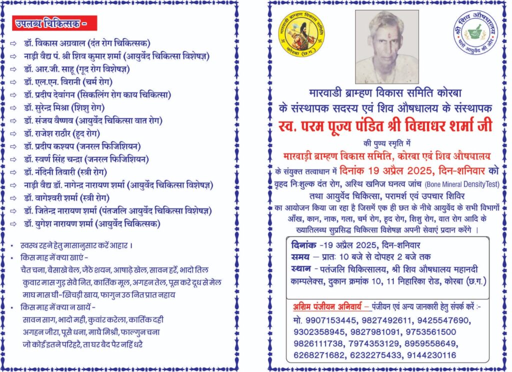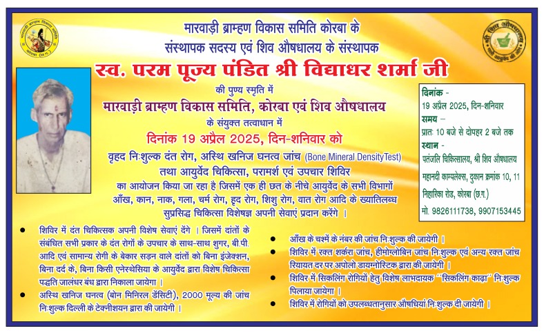 कोरबा, 16 अप्रैल (वेदांत समाचार)। मारवाड़ी ब्राह्मण विकास समिति एवं शिव औषधालय के संयुक्त तत्वाधान में वृहद् निशुल्क दंत रोग, अस्थि खनिज, घनत्व जांच (Bone Mineral Density Test) तथा आयुर्वेद चिकित्सा परामर्श एवं उपचार शिविर का आयोजन पतंजलि चिकित्सालय, श्री शिव औषधालय दुकान क्रमांक 10,11 महानदी काम्प्लेक्स निहारिका रोड कोरबा में दिनांक 19 अप्रैल 2025 शनिवार को प्रातः 10 बजे से मध्यान्ह 2 बजे तक किया जा रहा है।