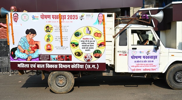 कोरिया,16अप्रैल 2025 (वेदांत समाचार) /पोषण पखवाड़ा (08 अप्रैल से 22 अप्रैल) के अंतर्गत आज जिला कलेक्टोरेट परिसर से पोषण रथ को अपर कलेक्टर अरुण कुमार मरकाम द्वारा हरी झंडी दिखाकर रवाना किया गया। यह रथ जिले के दूरस्थ गांवों में पहुंचकर गर्भवती महिलाओं, शिशुवती माताओं, 5 वर्ष तक के बच्चों तथा एनीमिया व कुपोषण से पीड़ित लोगों को स्वास्थ्य और पोषण के प्रति जागरूक करेगा।