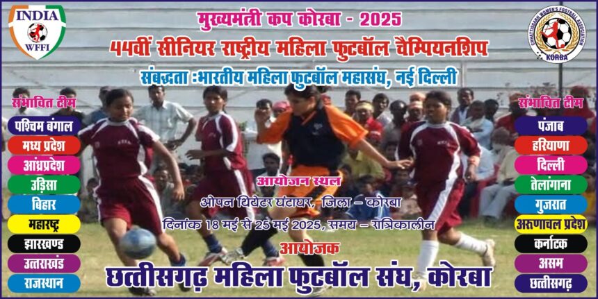 कोरबा / कोरबा एक बार फिर राष्ट्रीय स्तर पर महिला फुटबॉल का गौरवशाली आयोजन करने जा रहा है। मुख्यमंत्री कप कोरबा 2025 के अंतर्गत 44वीं सीनियर राष्ट्रीय महिला फुटबॉल चैम्पियनशिप का आयोजन 18 मई से 25 मई तक ओपन थिएटर, घंटाघर कोरबा में रात्रिकालीन मैचों के रूप में किया जाएगा। यह आयोजन भारतीय महिला फुटबॉल महासंघ, नई दिल्ली से संबद्ध है।