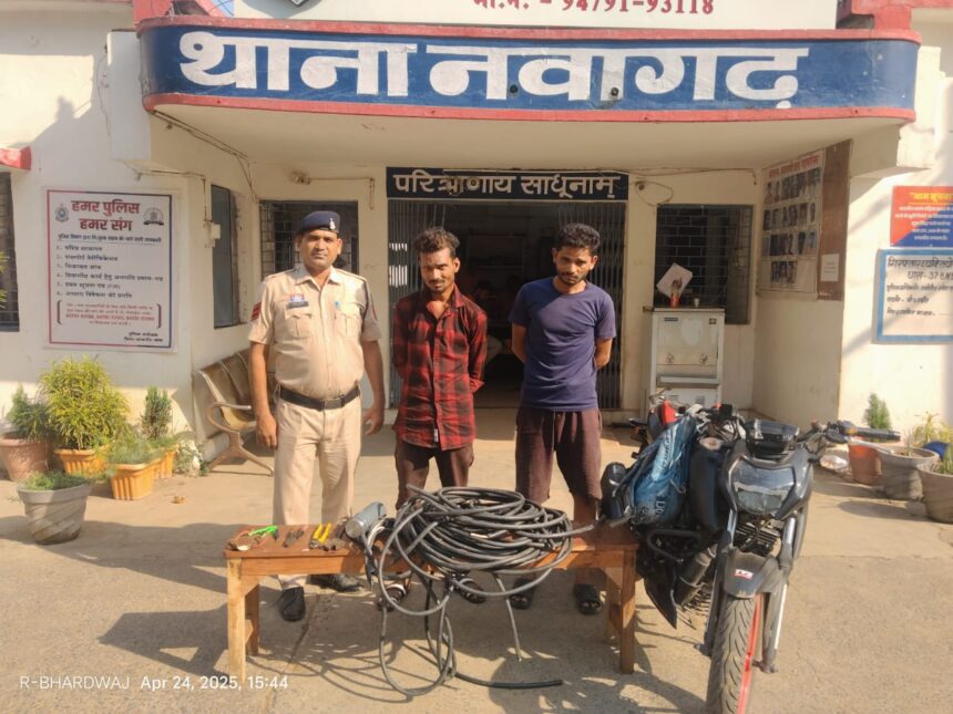 टावर में लगा केबल तार कटा हुआ कीमती 50000/ रुपए चोरी हुआ हैं कि सूचना थाना नवागढ़ पुलिस को मिलने पर त्वरित कार्रवाई करते हुए थाना प्रभारी नवागढ़ उप निरीक्षक पारस पटेल द्वारा तत्काल प्रकरण को गंभीरता से लेते हुए आरोपी 01.प्रवीण दास महंत उम्र 35 साल 02. सूरज चौहान उम्र 34 साल दोनो निवासी रामपुर कोरबा को पकड़ा जिसको हिरासत में लेकर घटना के संबंध में पूछताछ करने पर घटना घटित करना जुर्म स्वीकार किए जाने से चोरी का केबल तार और केबल काटने का सामन एवं चोरी में प्रयुक्त मोटर सायकल को बरामद किया जाकर आरोपियों को विधिवत दिनांक 24.04.25 को गिरफ्तार कर न्यायिक रिमांड पर भेजा गया है।