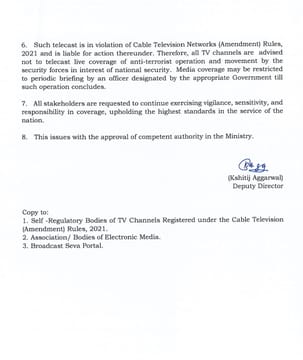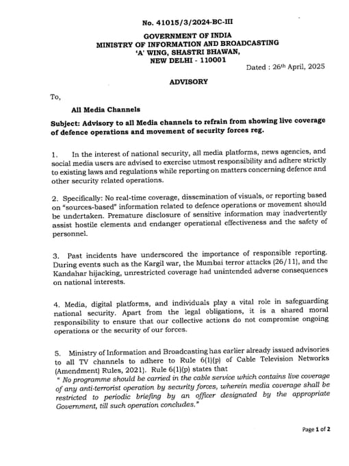नई दिल्ली,26 अप्रैल 2025। सूचना एवं प्रसारण मंत्रालय ने सभी मीडिया चैनलों को राष्ट्रीय सुरक्षा के हित में रक्षा अभियानों और सुरक्षा बलों की आवाजाही का सीधा प्रसारण न करने की सलाह जारी की है। सलाह में कहा गया है, “राष्ट्रीय सुरक्षा के हित में, सभी मीडिया प्लेटफॉर्म, समाचार एजेंसियों और सोशल मीडिया उपयोगकर्ताओं को सलाह दी जाती है कि वे रक्षा और अन्य सुरक्षा-संबंधी अभियानों से संबंधित मामलों पर रिपोर्टिंग करते समय अत्यधिक जिम्मेदारी का प्रयोग करें और मौजूदा कानूनों और विनियमों का सख्ती से पालन करें।”