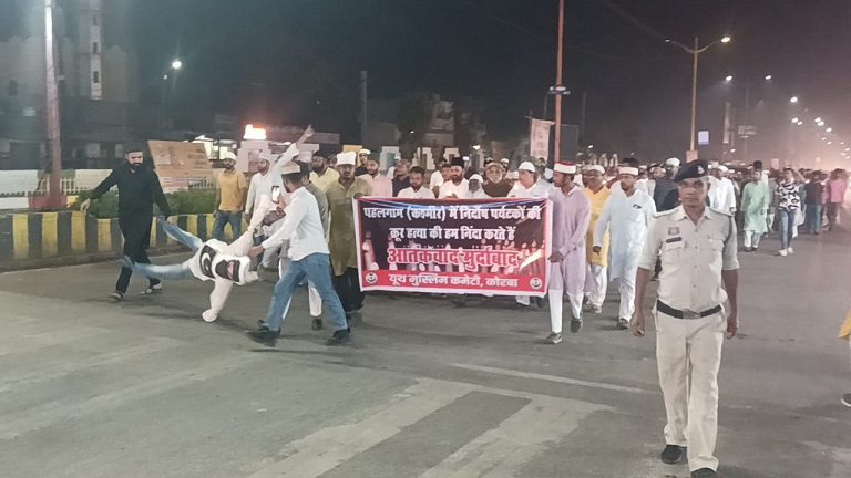 कोरबा,26 अप्रैल 2025(वेदांत समाचार)। कोरबा शहर के मुस्लिम समाज ने जम्मू कश्मीर के पहलगाम में हुए आतंकवादी हमले के विरोध में सड़कों पर उतरकर प्रदर्शन किया। गुरुवार की शाम 7:00 बजे नमाज के बाद बड़ी संख्या में मुस्लिम समाज के लोगों ने टी.पी नगर मस्जिद से टी.पी नगर चौक तक मौन जुलूस व कैंडल मार्च निकाला और आतंकवाद का पुतला दहन किया।