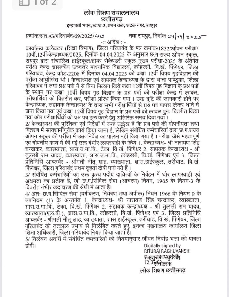 छत्तीसगढ़ राज्य ओपन स्कूल, रायपुर द्वारा आयोजित हाईस्कूल और हायर सेकेण्डरी मुख्य परीक्षा 2025 के दौरान गरियाबंद जिले के फिंगेश्वर विकासखंड अंतर्गत शासकीय उच्चतर माध्यमिक विद्यालय लोहरसी (केन्द्र कोड-2208) में गंभीर लापरवाही सामने आई है। 4 अप्रैल 2025 को आयोजित कक्षा 12वीं गृह विज्ञान विषय की परीक्षा के दौरान केन्द्राध्यक्ष और सहायक केन्द्राध्यक्ष द्वारा कक्षा 10वीं के गृह विज्ञान विषय के प्रश्न पत्रों का वितरण कर परीक्षा शुरू करा दी गई।