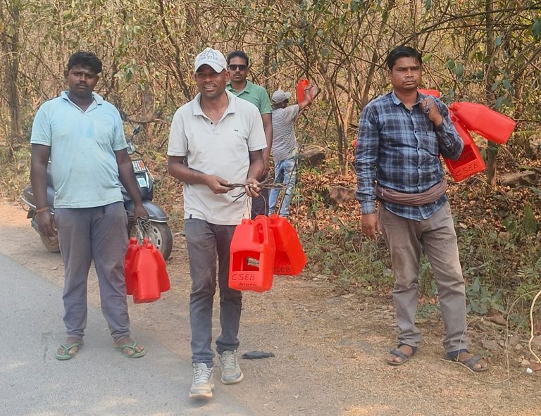 सारंगढ़ बिलाईगढ़, 27 अप्रैल 2025/गोमर्डा अभयारण्य के जंगलों में इन दिनों गर्मी दिन ब दिन बढ़ती ही जा रही है। यहां के प्यासे पक्षियों को राहत देने के बिजली विभाग में लाइनमेन पद पर कार्यरत मदन सिदार पुराने तेल के डिब्बे इकट्ठा कर उन्हें साफ कर पक्षियों के लिए जल पात्र बनकर इन डिब्बों को वे और इनके साथी सड़क किनारे और बाद में जंगल के भीतर भी पेड़ों पर लटका कर नियमित अंतराल पर पानी भरा जा रहा है। केवल सड़क किनारे ही नहीं बल्कि जंगल के भीतर भी पक्षियों और कभी-कभी बंदरों के लिए भी पानी की व्यवस्था कर रहे हैं।
