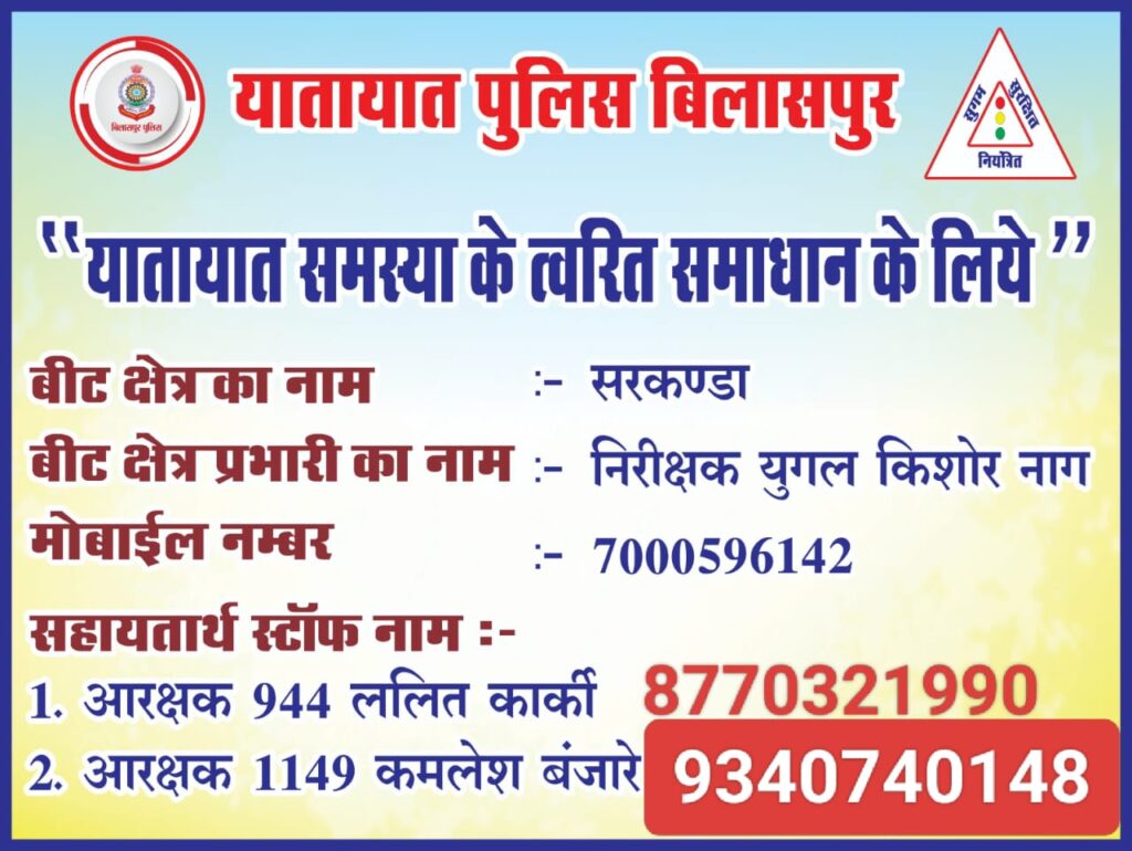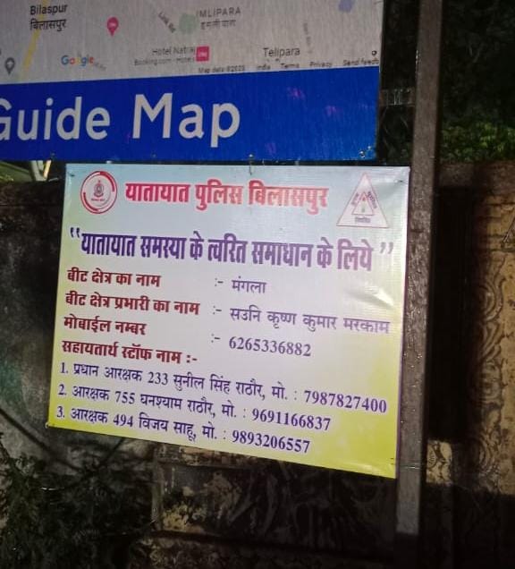 बिलासपुर, 27 अप्रैल । वरिष्ठ पुलिस अधीक्षक रजनेश सिंह के दिशा निर्देश एवं अतिरिक्त पुलिस अधीक्षक यातायात रामगोपाल करियारे के मार्गदर्शन में शहर के समस्त नागरिकों को सुविधा प्रदान करने हेतु यातायात पुलिस बिलासपुर के द्वारा अपने समस्त एरिया प्रभारी का “नामावली बोर्ड” एरिया के प्रमुख जगह पर लगाई जा रही है ताकि यातायात से संबंधित किसी भी प्रकार की समस्याओं के त्वरित निराकरण हेतु संबंधित एरिया के प्रभारी अधिकारी एवं अधीनस्थ कर्मचारियों की जानकारी प्राप्त हो सके एवं उनसे संपर्क स्थापित कर शीघ्र ही किसी भी प्रकार की यातायात समस्या या अप्रिय स्थिति के दौरान नागरिकों द्वारा त्वरित संपर्क स्थापित किया जा सके।