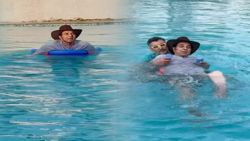 स्विमिंग पूल में दिखे धर्मेंद्र