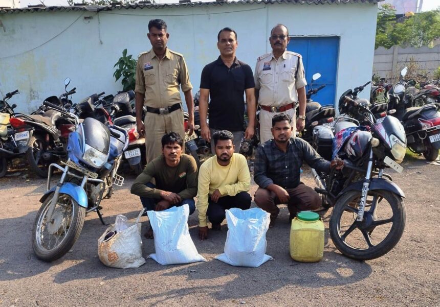 रायगढ़, 29 अप्रैल, (वेदांत समाचार)। पुलिस अधीक्षक दिव्यांग पटेल के निर्देशन पर चलाए जा रहे अवैध शराब के खिलाफ अभियान के तहत मंगलवार को कोतरारोड़ पुलिस ने डीएसपी सुशांतो बनर्जी के मार्गदर्शन और थाना प्रभारी त्रिनाथ त्रिपाठी के नेतृत्व में नवापारा क्षेत्र में दो अलग-अलग स्थानों पर छापामार कार्रवाई कर करीब 50 लीटर कच्ची महुआ शराब जब्त की। दोनों कार्रवाइयों में तीन आरोपियों को गिरफ्तार कर उनके कब्जे से दो मोटरसाइकिल समेत कुल 51,500 रुपये मूल्य का सामान बरामद किया गया।