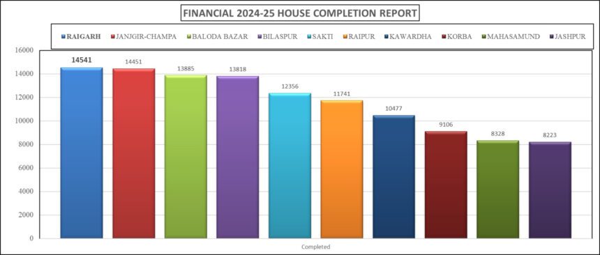 रायपुर, 29 अप्रैल 2025। प्रधानमंत्री आवास योजना (ग्रामीण) के तहत रायगढ़ जिले ने पूरे छत्तीसगढ़ में अव्वल प्रदर्शन करते हुए एक मिसाल कायम की है। आवास निर्माण के क्षेत्र में रायगढ़ प्रदेश का नंबर एक जिला बन गया है। वर्ष 2024-25 में जिले को मिले 60,609 आवासों के लक्ष्य में से अब तक 52,307 आवासों को स्वीकृति दी जा चुकी है, और इनमें से 14,541 आवासों का निर्माण कार्य पूर्ण कर लिया गया है, जो पूरे राज्य में सर्वाधिक है।