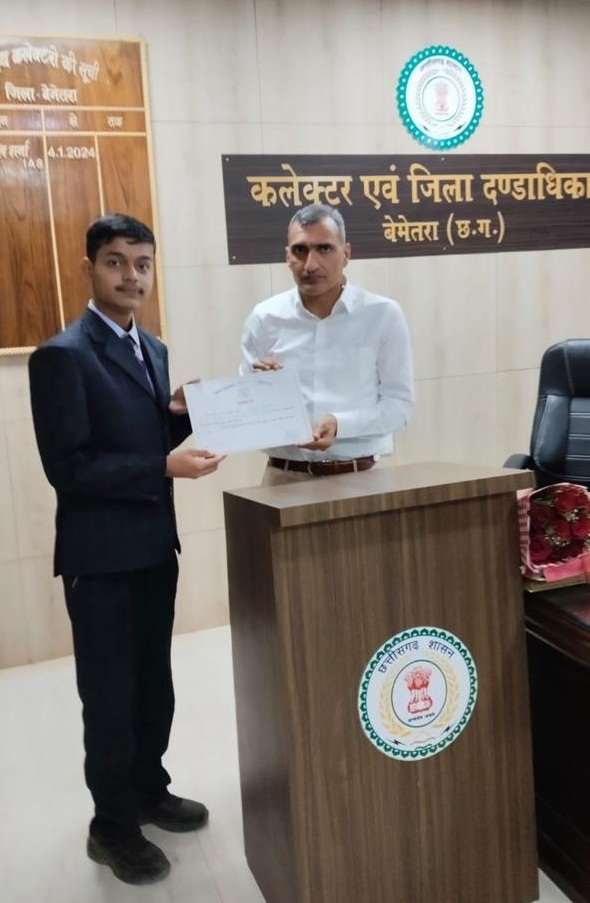 Bemetara, March 22, 2025: Master Aditya Tiwari, a student of Allons Public School (New Sainik School), received a prestigious call from the Collector’s office for a special felicitation in recognition of his remarkable academic achievement.