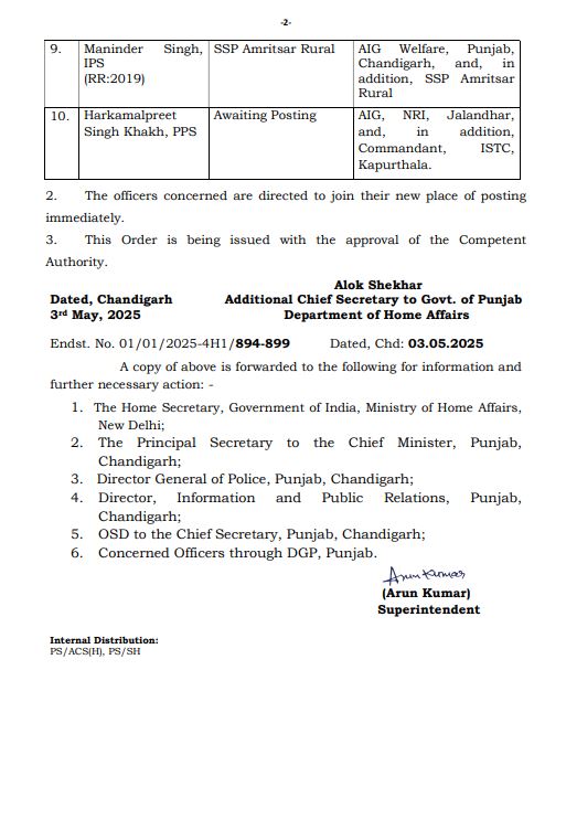 पंजाब : पंजाब सरकार ने प्रशासनिक सुधारों के तहत 9 IPS और एक PPS अधिकारी के तबादले किए गए हैं। यह कदम राज्य में प्रशासनिक कार्यों को बेहतर ढंग से चलाने और पारदर्शिता बढ़ाने के उद्देश्य से उठाया गया है।