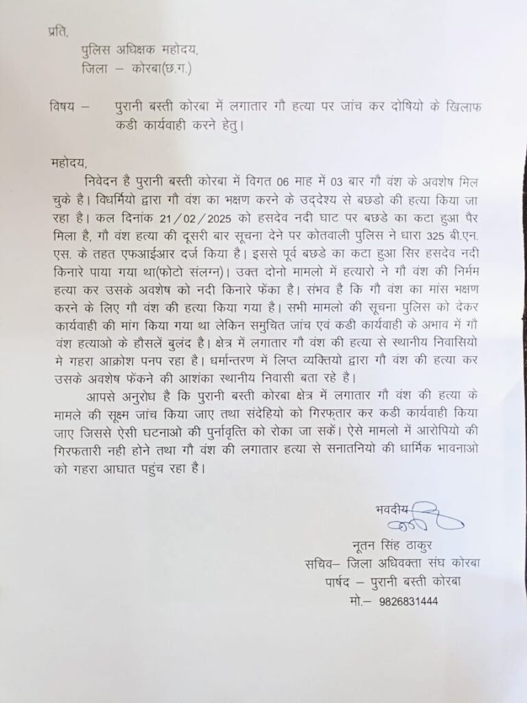 पुरानी बस्ती कोरबा में लगातार गौ वंश की हत्या हो रही है जिसे क्षेत्र के लोगों में गहरा आक्रोश व्याप्त है । पूरानी बस्ती कोरबा के नवनिर्वाचित पार्षद नूतनसिंह ठाकुर ने कोतवाली पुलिस पर तत्काल एफआईआर दर्ज दबाव बनाया उसके बाद कोतवाली पुलिस ने धारा 325 BNS के तहत अज्ञात लोगों के खिलाफ FIR दर्ज कर लिया है।