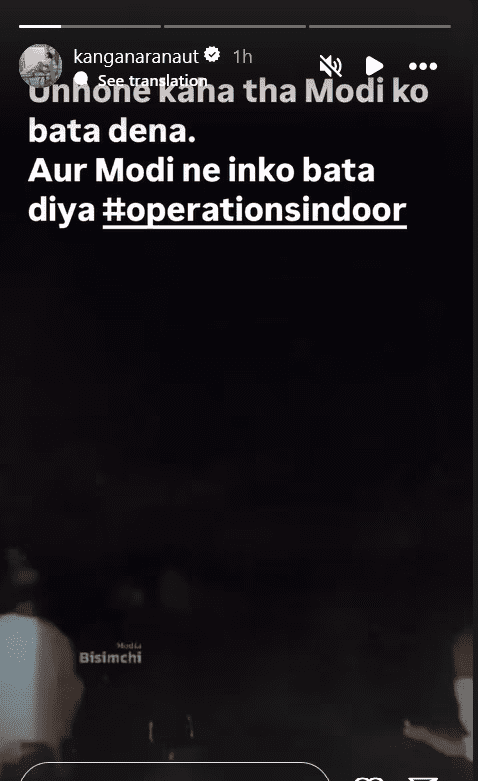 बता दें कि कंगना रनौत (Kangana Ranaut) ने अपने इंस्टाग्राम पर स्टोरी शेयर करते हुए लिखा कि- ‘उन्होंने कहा था मोदी को बता देना और मोदी ने इनको बता दिया.’ दूसरी पोस्ट में कंगना रनौत (Kangana Ranaut) ने लिखा- जो हमारी रक्षा करते हैं, ईश्वर उनकी रक्षा करे. फोर्स की सेफ्टी और सक्सेस की कामना करती हूं. ऑपरेशन सिंदूर.