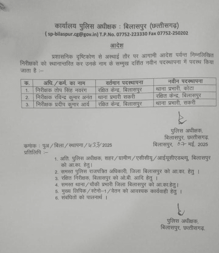 बिलासपुर, 08 मई (वेदांत समाचार)। वरिष्ठ पुलिस अधीक्षक (SSP) रजनेश सिंह ने पुलिस महकमे में फेरबदल करते हुए तीन थाना प्रभारियों के ट्रांसफर आदेश जारी किए हैं. इस आदेश के तहत कोटा और सकरी थानों में नए टीआई की नियुक्ति की गई है, जबकि एक थानेदार को पुलिस लाइन अटैच कर दिया गया है.