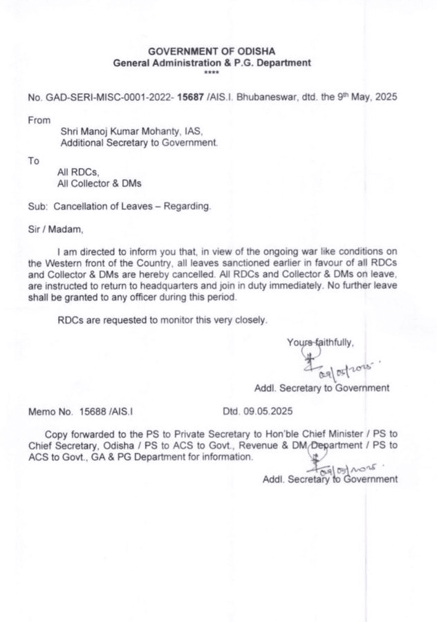 भुवनेश्वर,10 मई 2025। ओडिशा सरकार ने युद्ध जैसे हालात को देखते हुए राजस्व मंडल अधिकारी (आरडीसी), कलेक्टर और जिला मजिस्ट्रेट (डीएम) की सभी स्वीकृत छुट्टियां रद्द कर दी हैं। सरकार ने इन अधिकारियों को तुरंत मुख्यालय लौटने और ड्यूटी पर लौटने का निर्देश दिया है।