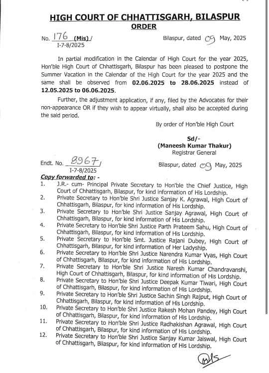 बिलासपुर,11 मई (वेदांत समाचार). हाईकोर्ट बिलासपुर ने ग्रीष्मकालीन अवकाश की तिथि बढ़ाए जाने के संबंध में जारी आदेश को वापस ले लिया है. अब ग्रीष्मकालीन अवकाश की तिथि पहले की तरह रहेगी. बता दें कि भारत-पाकिस्तान के बीच बढ़ते तनाव के चलते छत्तीसगढ़ हाईकोर्ट में गर्मी छुट्टियां रद्द कर दी गई थी. पहले 12 मई से 6 जून तक समर वेकेशन निर्धारित था, जिसे 2 जून से 28 जून तक कर दिया गया था. यह आदेश चीफ जस्टिस के निर्देश पर रजिस्ट्रार जनरल ने जारी किया था.