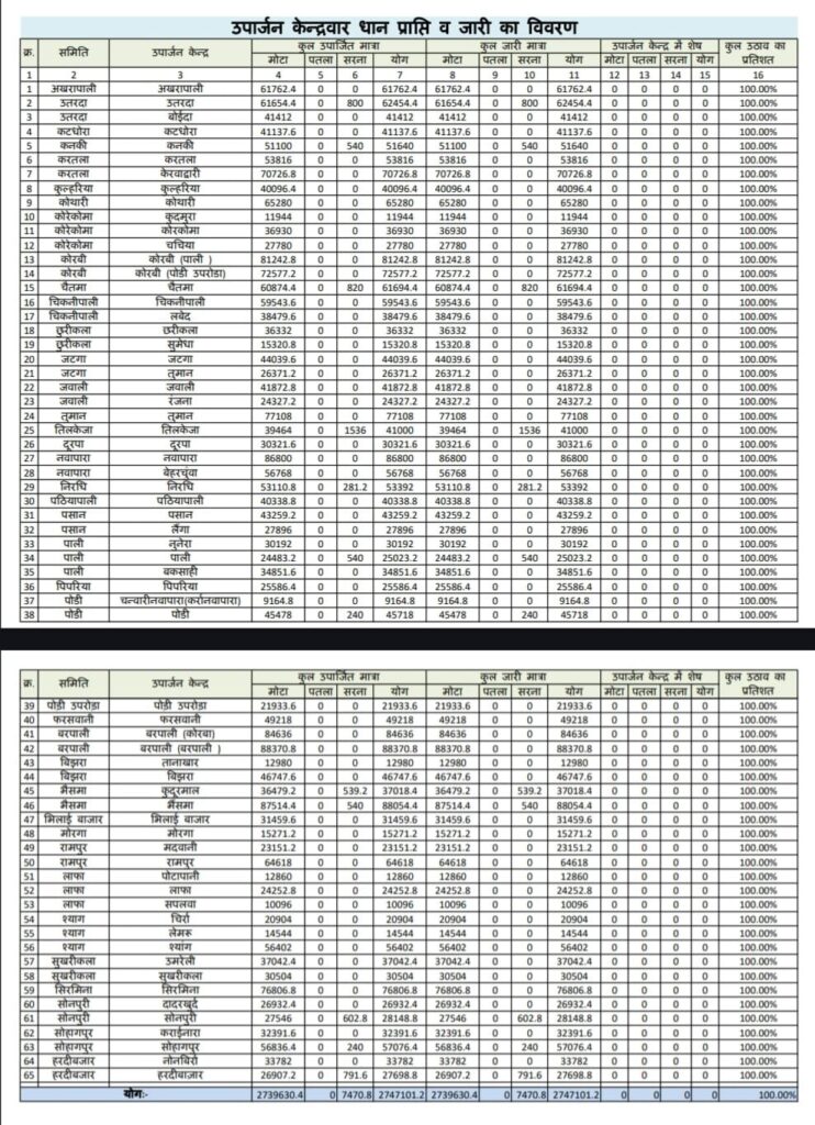 जिले की 41 समितियों के 65 उपार्जन केंद्रों के माध्यम से 43 हजार 681 किसानों से धान खरीदी की गई। 1 दिसंबर से 31 जनवरी तक चले इस अभियान को शासन द्वारा अतिरिक्त समय दिए जाने के बाद 7 फरवरी तक पूरा किया गया। विपरीत परिस्थितियों के बावजूद प्रशासन ने धान के सुरक्षित भंडारण और समय पर उठाव सुनिश्चित किया।