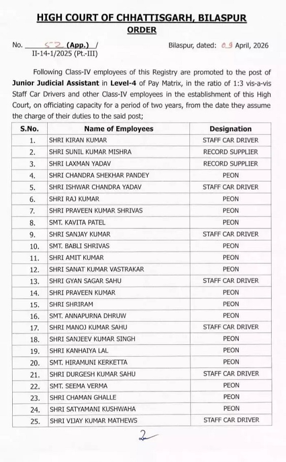 छत्तीसगढ़ बिलासपुर हाई कोर्ट ने अपने आदेश में लिखा है, छत्तीसगढ़ बिलासपुर हाई कोर्ट रजिस्ट्री के श्रेणी-IV कर्मचारियों को वेतन मैट्रिक्स के स्तर-4 में कनिष्ठ न्यायिक सहायक के पद पर, इस उच्च न्यायालय के कर्मचारियों और अन्य श्रेणी-IV कर्मचारियों के सापेक्ष 1:3 के अनुपात में, कार्यवाहक क्षमता में दो वर्ष की अवधि के लिए पदोन्नत किया जाता है, जिस तिथि से वे उक्त पद पर अपने कर्तव्यों का कार्यभार ग्रहण करते हैं।