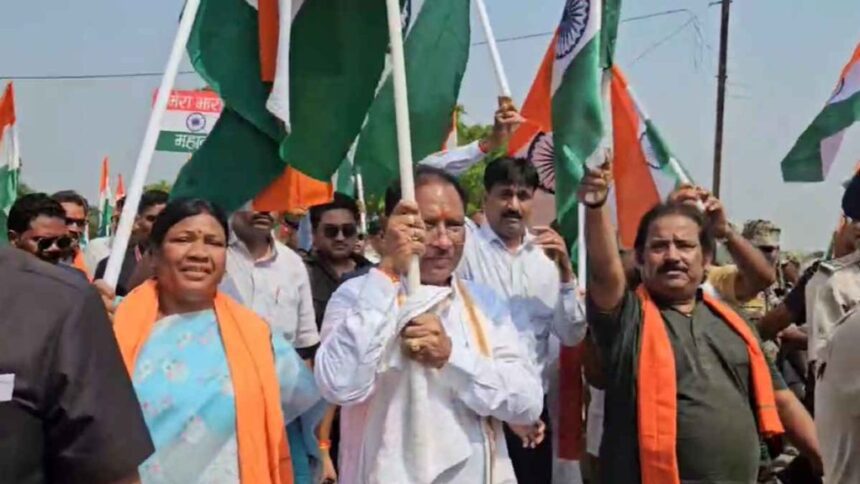 जशपुर,17 मई (वेदांत समाचार)। मुख्यमंत्री विष्णु देव साय ‘ऑपरेशन सिंदूर’ की सफलता का जश्न मनाते हुए भारतीय सशस्त्र बलों के साहस और वीरता का सम्मान करने जशपुर स्थित चराईडाँड़ में आज आयोजित “तिरंगा यात्रा ‘ में शामिल हुए. मुख्यमंत्री साय ढोल-मांदर की थाप और देशभक्ति से ओत-प्रोत गानों के बीच हजारों लोगों के साथ कदम से कदम मिलाकर चले.
