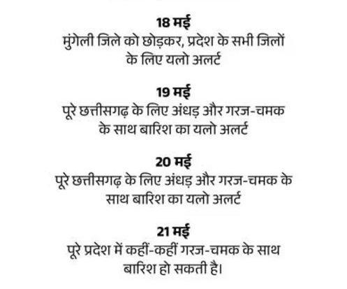 इससे पहले 4 दिन पांचों संभाग के जिलों में यलो अलर्ट जारी है। इस दौरान 40-50 किमी की रफ्तार से हवा चल सकती है। गरज चमक के साथ कहीं-कहीं बिजली गिरने की आशंका है। बस्तर और सरगुजा संभाग के जिलों में इसका ज्यादा असर रहेगा।