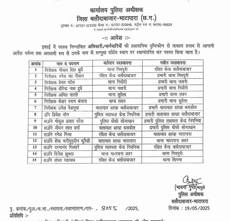 बलौदाबाजार,19 मई (वेदांत समाचार). पुलिस प्रशासन में कसावट लाने पुलिस अधीक्षक भावना गुप्ता ने थाना प्रभारियों का तबादला किया है. अधिकांश थाना प्रभारी अपने पूर्व में पदस्थ थाने में स्थानांतरित होने से काफी प्रसन्न हैं, ताकि उन्हें ज्यादा परेशानी नहीं उठानी पडे़गी. फिलहाल देखना होगा कि नई पुलिस अधीक्षक के इस स्थानांतरण आदेश से अपराध में क्या कमी आती है. किस तरह कसावट आता है यह तो आने वाला समय बताएगा.
