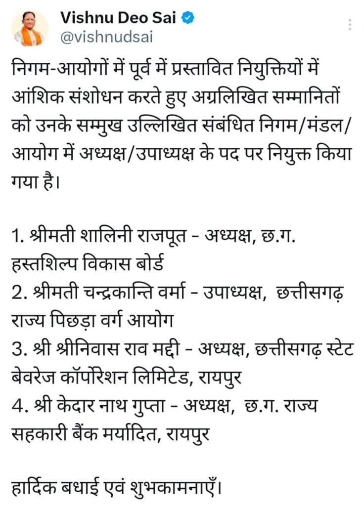 - मुख्यमंत्री विष्णु देव साय ने निगम/मंडल/आयोग में नियुक्त अध्यक्षों एवं उपाध्यक्ष को दी शुभकामनाएं