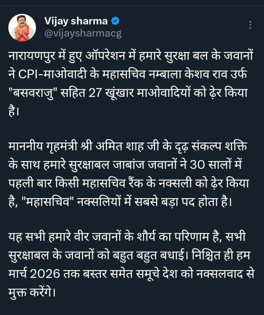 रायपुर, 21 मई, 2025 (वेदांत समाचार)। उपमुख्यमंत्री एवं गृहमंत्री विजय शर्मा ने कहा कि नारायणपुर जिले में सुरक्षाबलों द्वारा चलाए गए एक सुनियोजित ऑपरेशन में देश को नक्सलवाद के खिलाफ अब तक की सबसे बड़ी सफलता प्राप्त हुई है। इस ऑपरेशन में सीपीआई-माओवादी के महासचिव नम्बाला केशव राव उर्फ “बसवराजु” सहित 27 खूंखार माओवादी मारे गए हैं।