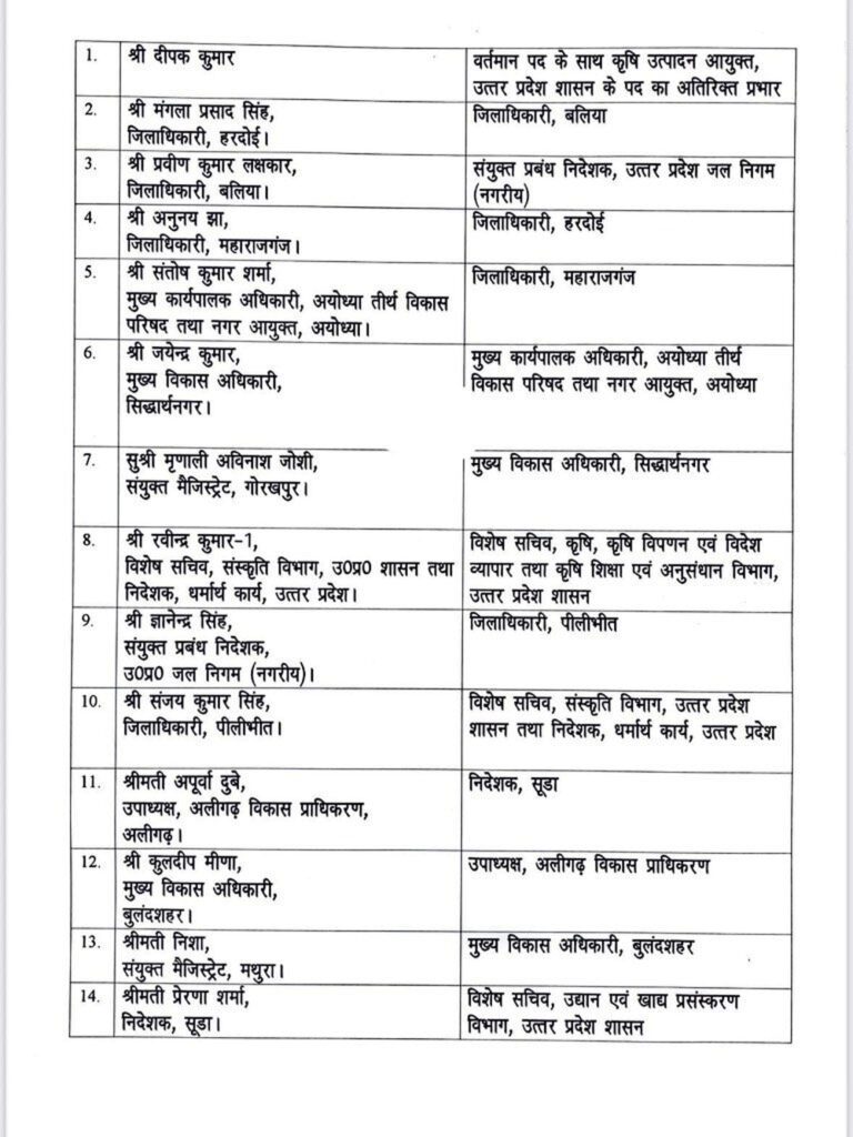 सरकार ने बड़ा प्रशासनिक फेरबदल किया है। सरकार ने मंगलवार देर रात IAS और PCS अफसरों का तबादला किया गया है। जारी आदेश के मुताबिक 14 आईएएस और 6 पीसीएस अफसरों का ट्रांसफर हुआ है। जिनकी नीचे दी गई सूची निम्न है।