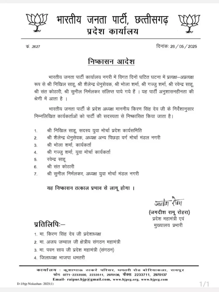 रायपुर, 29 मई (वेदांत समाचार)। भारतीय जनता पार्टी छत्तीसगढ़ इकाई ने पार्टी के 7 पदाधिकारी और कार्यकर्ताओं को 6 साल के लिए निष्कासित कर दिया है। इस कार्रवाई की जद में आये नेताओं में युवा मोर्चा प्रदेश कार्य समिति के सदस्य निखिल साहू, नगरी मंडल के पिछड़ा वर्ग मोर्चा के मंडल अध्यक्ष साहिलेन्द्र धेनुसेवक, युवा मोर्चा के मंडल अध्यक्ष सुनील निर्मलकर शामिल है।