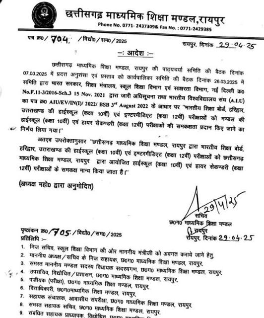 रायपुर,29मई 2025(वेदांत समाचार)। छत्तीसगढ़ सरकार ने भारतीय शिक्षा बोर्ड, हरिद्वार को छत्तीसगढ़ माध्यमिक शिक्षा मंडल (सीजीबीएसई) की कक्षा 10वीं और 12वीं के समकक्ष मान्यता प्रदान कर दी है। माध्यमिक शिक्षा मंडल (माशिमं) के सचिव ने इस संबंध में आदेश जारी किया है। इस निर्णय के साथ ही छत्तीसगढ़ में मान्यता प्राप्त बोर्डों की संख्या बढ़कर चार हो गई है, जिनमें भारतीय शिक्षा बोर्ड (हरिद्वार), आईसीएसई, सीबीएसई और छत्तीसगढ़ ओपन स्कूल शामिल हैं।
