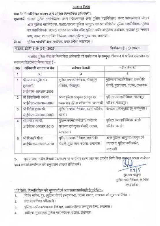 0.एक बार फिर तबादले किए गए हैं। मिली जानकारी के मुताबिक यूपी में पांच आईपीएस अफसरों का तबादला किया गया है। आईपीएस दिनेश कुमार पी को केंद्रीय प्रतिनियुक्ति के लिए कार्यमुक्त किया गया है।