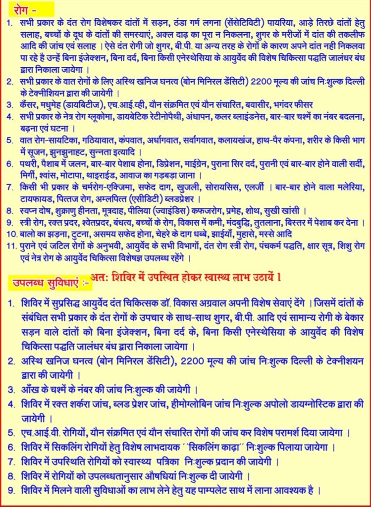 दंत रोगियों के लिए विशेष सुविधा उपलब्ध रहेगी, जहां दंत विशेषज्ञ डॉ. विकास अग्रवाल द्वारा बिना दर्द और बिना एनेस्थीसिया के आयुर्वेदिक विधि से दांतों का उपचार किया जाएगा। वहीं आंखों की जांच कर चश्मे के नंबर का कार्ड भी निशुल्क दिया जाएगा।