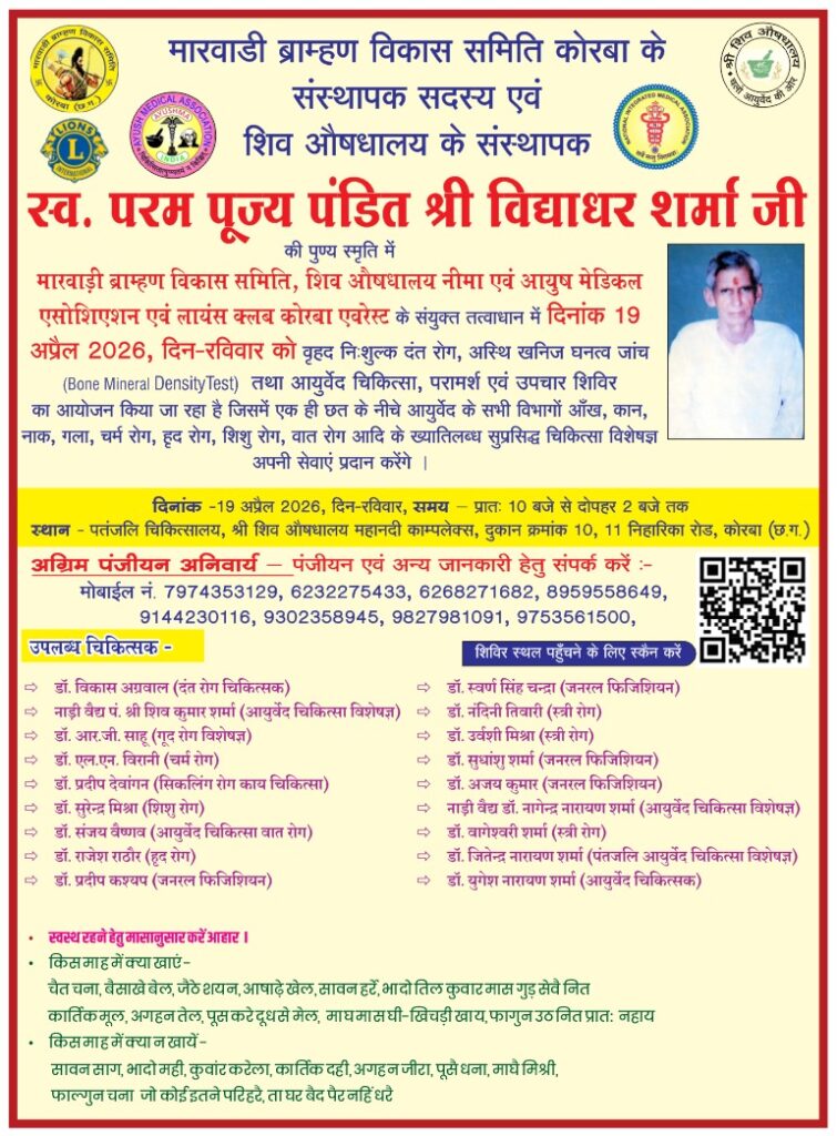 कोरबा, 14 अप्रैल (वेदांत समाचार)। Korba में 19 अप्रैल 2026 को एक बड़ा Free Health Camp आयोजित होने जा रहा है, जिसमें लोगों को दंत रोग, आयुर्वेदिक उपचार और बोन मिनरल डेंसिटी (BMD) जांच सहित कई स्वास्थ्य सेवाएं पूरी तरह निशुल्क मिलेंगी। यह शिविर स्वर्गीय पंडित विद्याधर शर्मा की पुण्यतिथि के अवसर पर आयोजित किया जा रहा है।