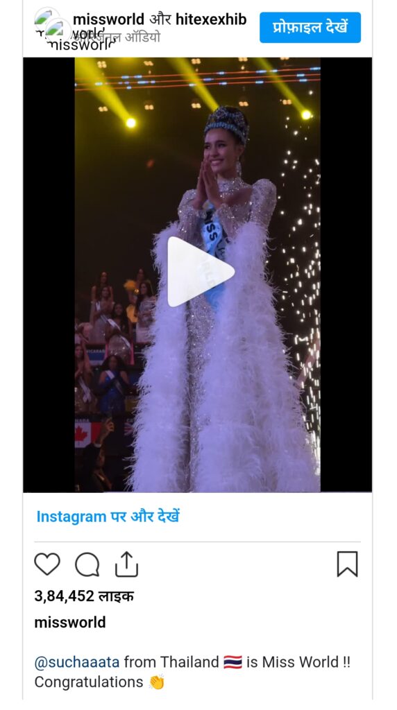 ओपल सुचता चुऊंग्स्री ने साल 2024 में मिस यूनिवर्स थाईलैंड प्रतियोगिता में जीत दर्ज की थी. उसके बाद वो मिस वर्ल्ड में अपने देश को रिप्रेजेंट करने आई थीं और उन्होंने इस कॉम्पटीशन में दुनियाभर के कंटेस्टेंट को पीछे छोड़ते हुए बाजी मार ली.